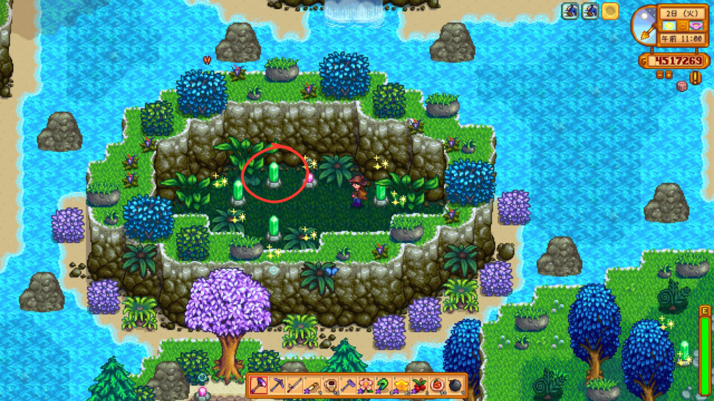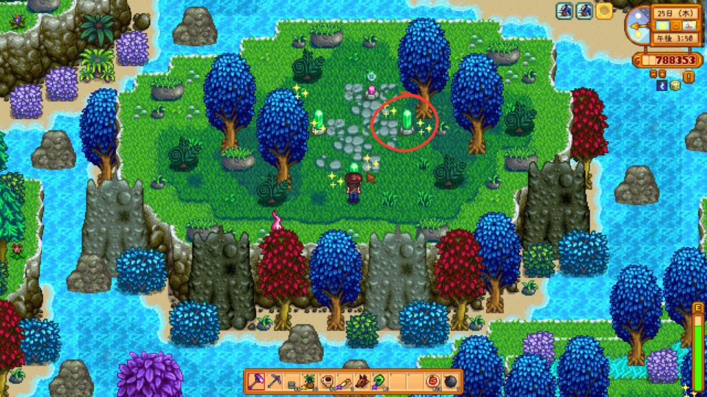 攻略のためのワープは緑色のクリスタルで、帰るためのワープはピンクのクリスタルです。