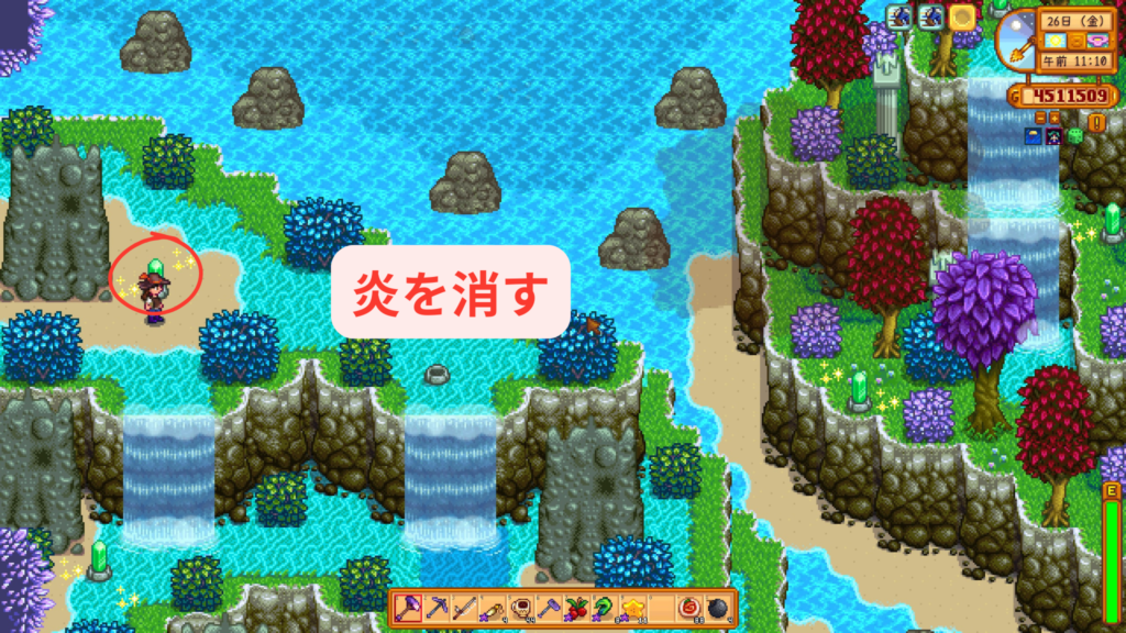 ざっくり、1個目の終着点から、上→右→右→同→炎を消して、同→同→左