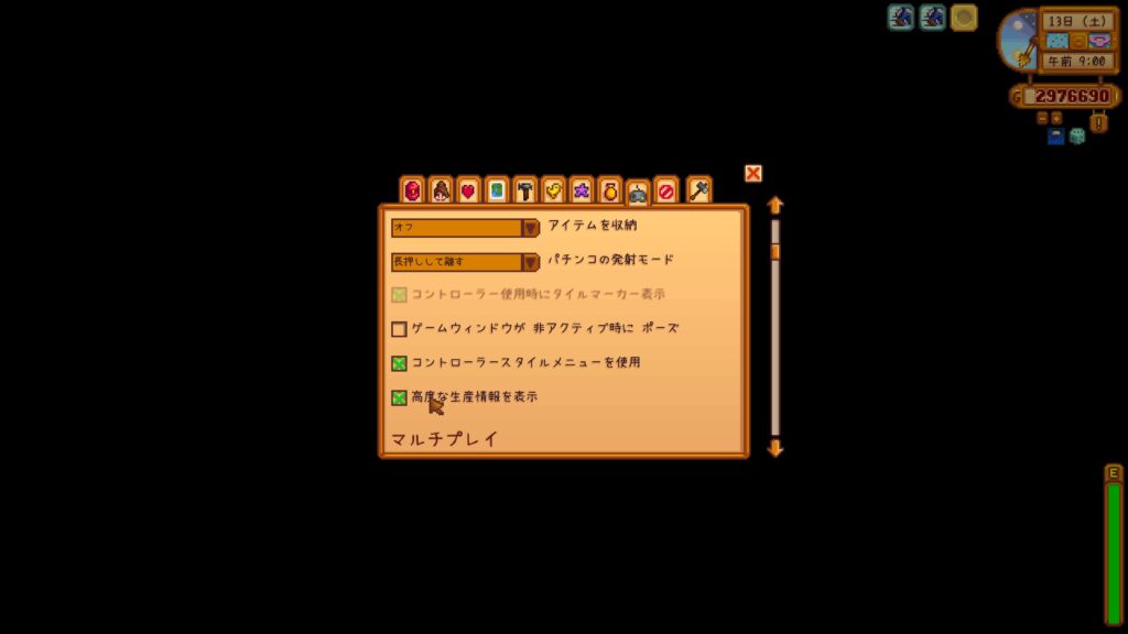 設定画面から、「高度な生産情報を表示」にチェックを入れる