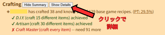 Craftingの項目を探して、Show Detailsを選ぶと、何を手に入れてないか(レシピが無いのか、作ってないのか)